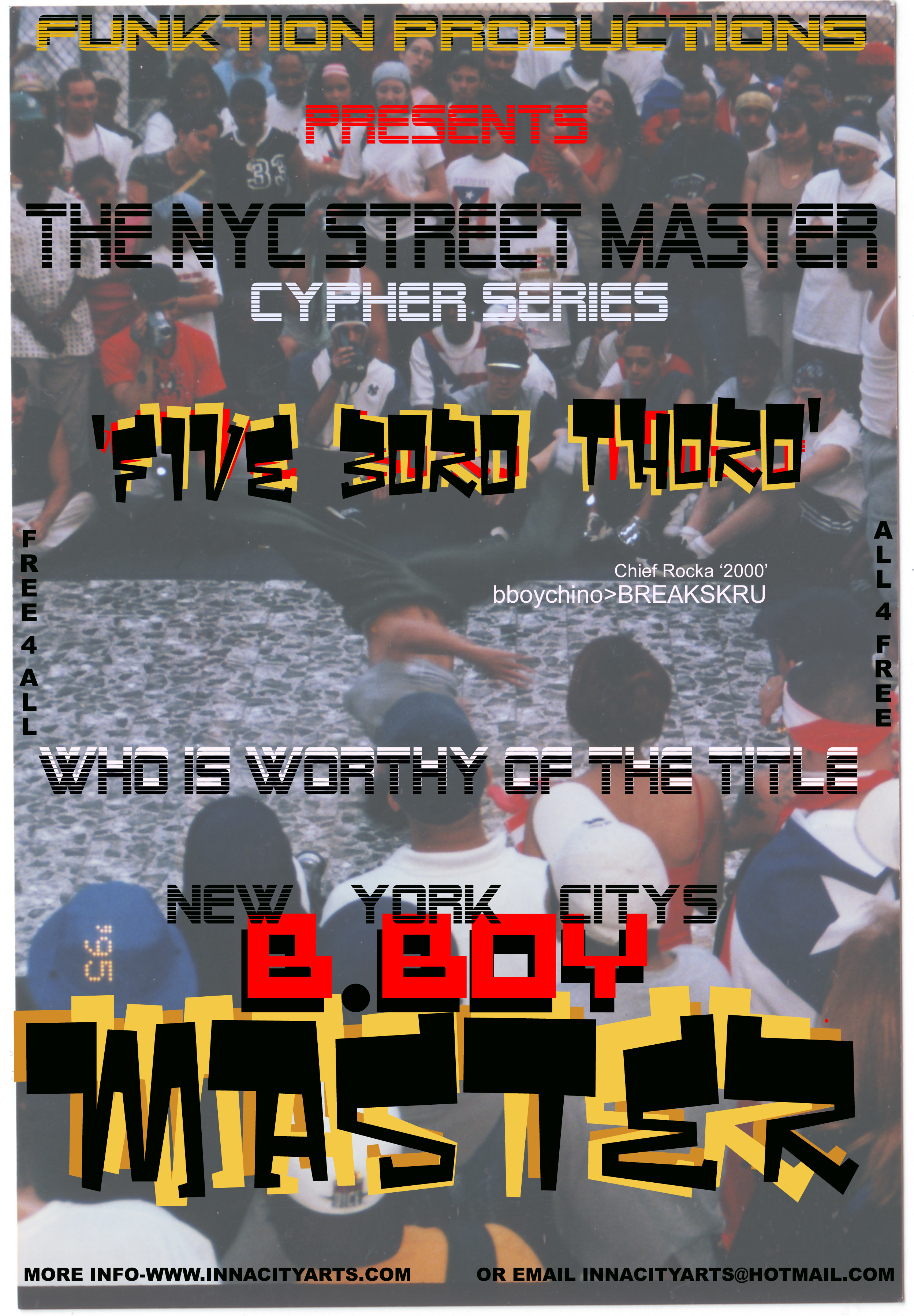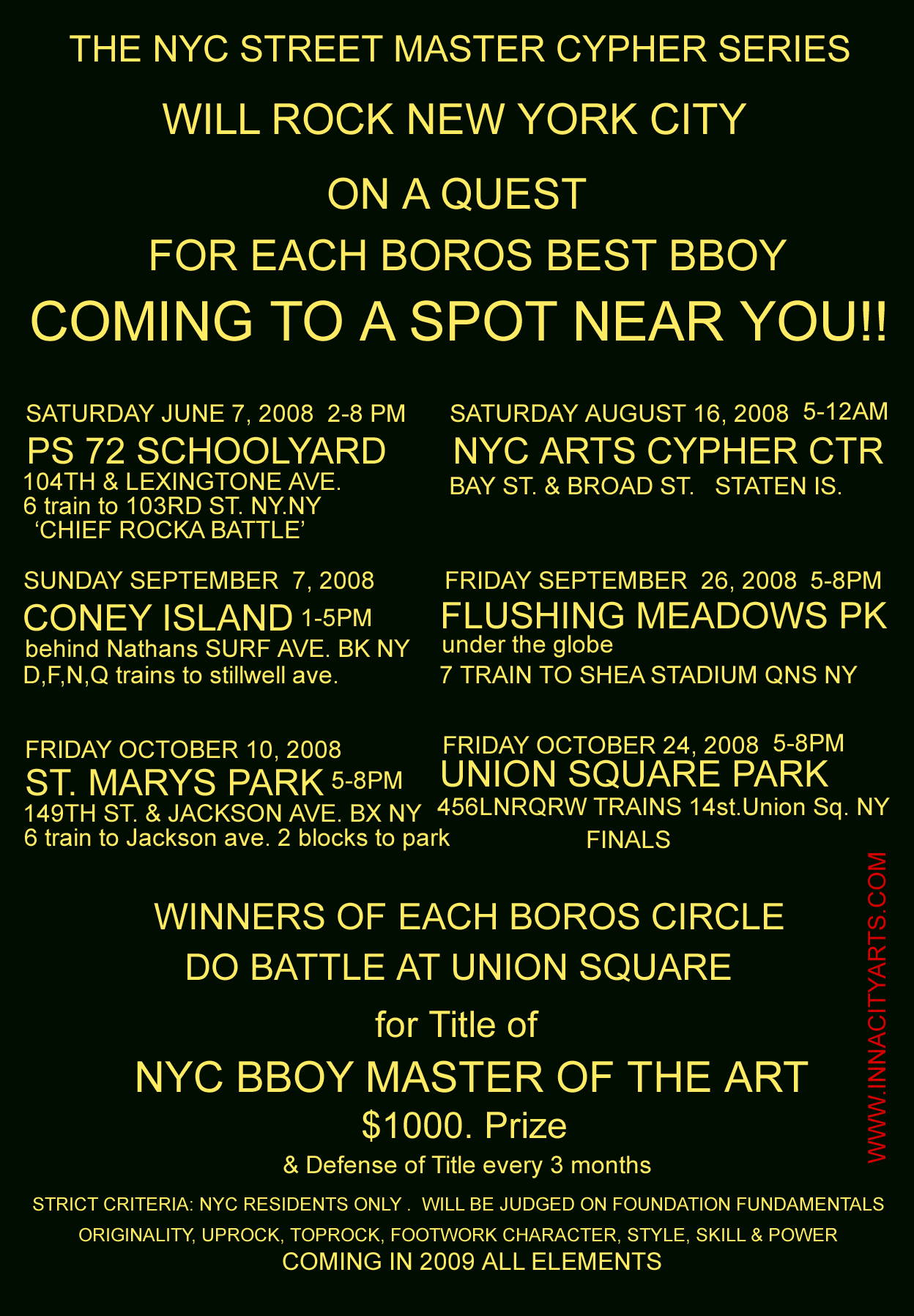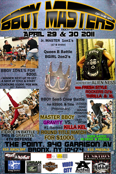 HOW IT WORKS- BBOYING BEING A COMBATIVE DANCE FORM. THIS SERIES IS STRUCTURED SIMILAR TO THE MARTIAL ARTS & FIGHT SPORTS. THERE ARE RANKINGS, CONTENDERS, TITLE HOLDERS ["MASTERS"], TITLE MATCHES AND TITLE DEFENSES. -THE WINNER OF THE UNDERCARD WILL BATTLE "MASTER" FOR THE TITLE & PUR$E IN THE NEXT EVENT.- -"MASTERS" COME BACK TO DEFEND TITLE & EARN $1000 [$2000 CREWS] FOR EACH CONSECUTIVE WIN.- -TO BREAK INTO THE RANKINGS, A COMPETITOR(S) MUST MAKE IT INTO THE FINAL FOUR BATTLES IN THAT CATEGORY.- [THE SERIES GOAL IS TO TAKE PLACE EVERY 3 MONTHS. AS IS, WITHOUT A "HOME" VENUE, THE EVENT OCCURS EVERY 3-12 MONTHS.] |